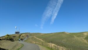 駐車場から数分歩いて大観峰へ向かいます。緩やかな坂が続きました。この道から見える景色は遠くまで小高い丘が続いており大陸のような景色でした。