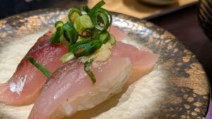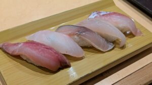 九州近郊の海で獲れる魚は光ものが多いのか、注文してテーブルに並んだ寿司はやさしい色合いとなりました。