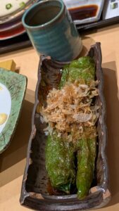 二番目に衝撃的だった一品ものは「ししとう」です。奥にある湯呑と比較すると分かると思いますが、サイズが大きく、かじりついて食べました。食べると口の中いっぱいにししとうが広がっていきますが、辛さは大してなく、ガツガツ食べられます。