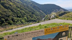 完成して日が浅い大橋で小休憩しました。周囲の大自然とミスマッチした人工物ですが、観光や暮らしの要となっている重要な橋です。橋がかけられている場所がとても高く、建築技術に驚きました。
